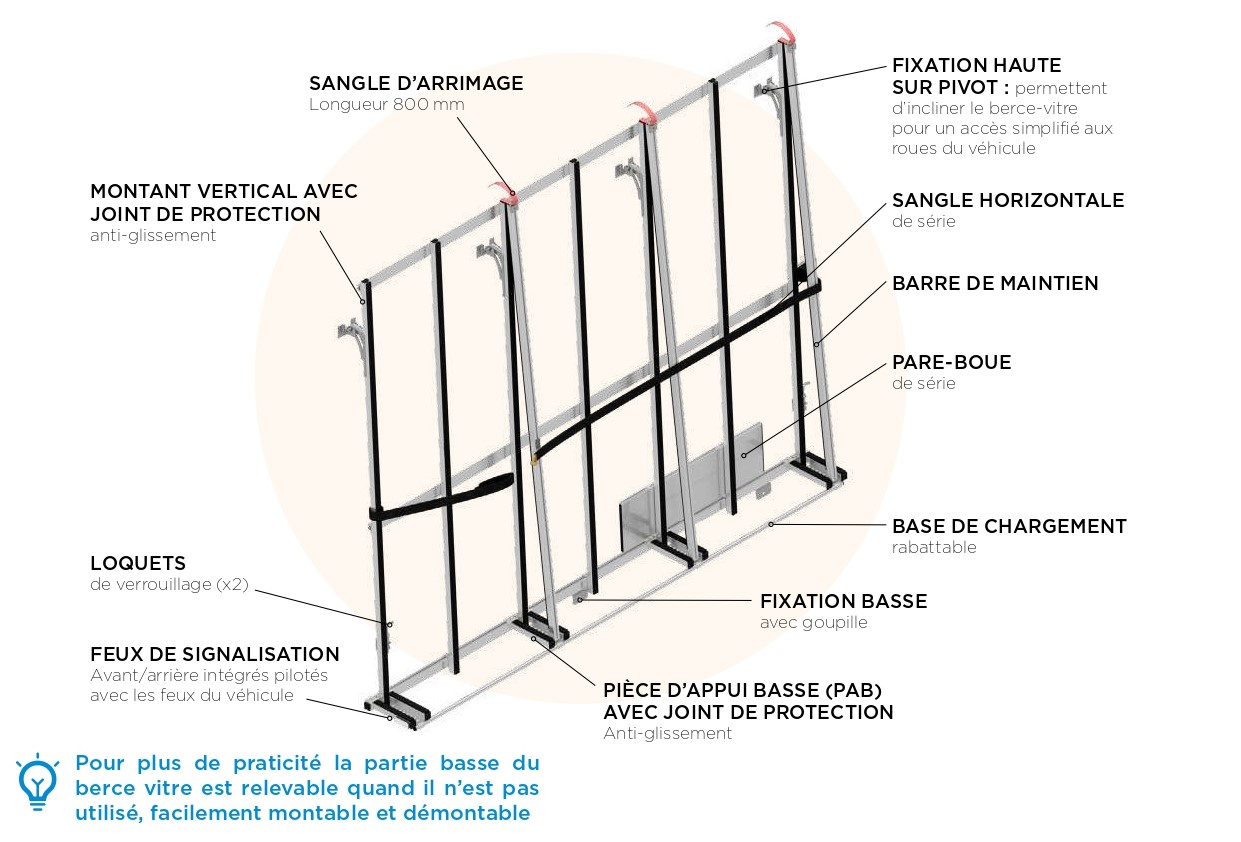 Indispensable pour transporter en toute sécurité vos charges lourdes, volumineuses et fragiles (fenêtres, portes, vitrage, portails), le berce vitre extérieur est conçu pour se monter et se démonter rapidement. Vous pouvez ainsi l’adapter aisément sur plusieurs véhicules identiques et optimiser votre parc de véhicules.