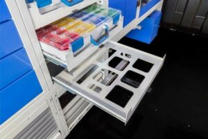 Extrêmement résistant aux chocs, le boîtier en plastique s’adapte directement sur le plateau coulissant du tiroir et est équipé d’un système de verrouillage avec un bouton au centre du plateau.