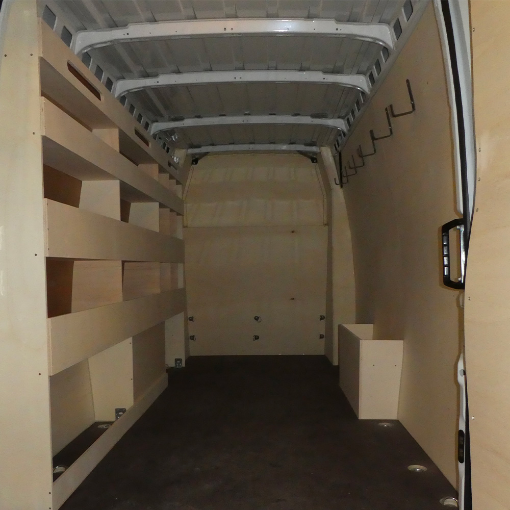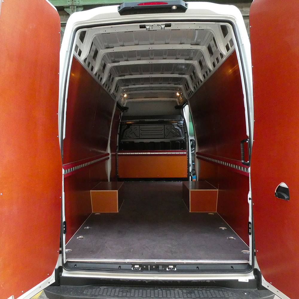 L’Iveco Daily est conçu pour les missions les plus exigeantes : fort volume de chargement, haute capacité utile et structure renforcée. AVD exploite tout son potentiel avec des aménagements sur mesure : plancher antidérapant, habillage bois filmé ou polypropylène, rails d’arrimage, mobiliers professionnels, tiroirs profonds, modules de rangement renforcés.