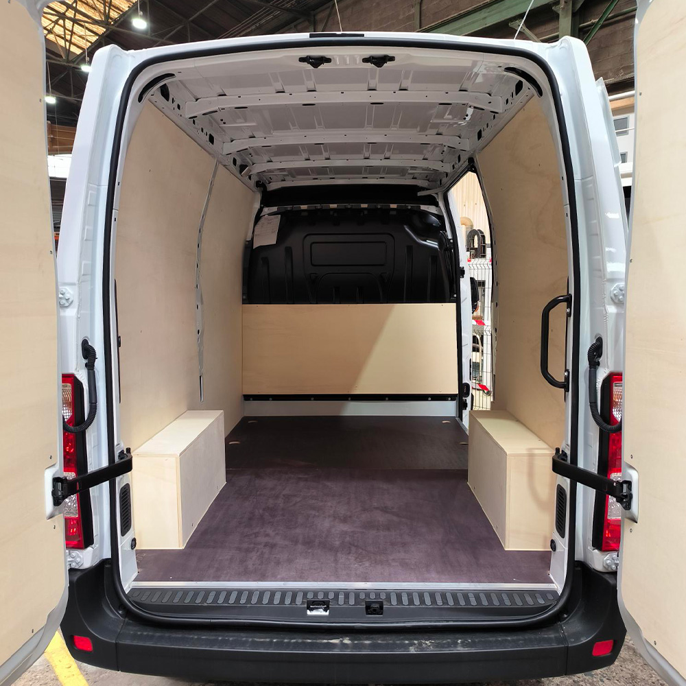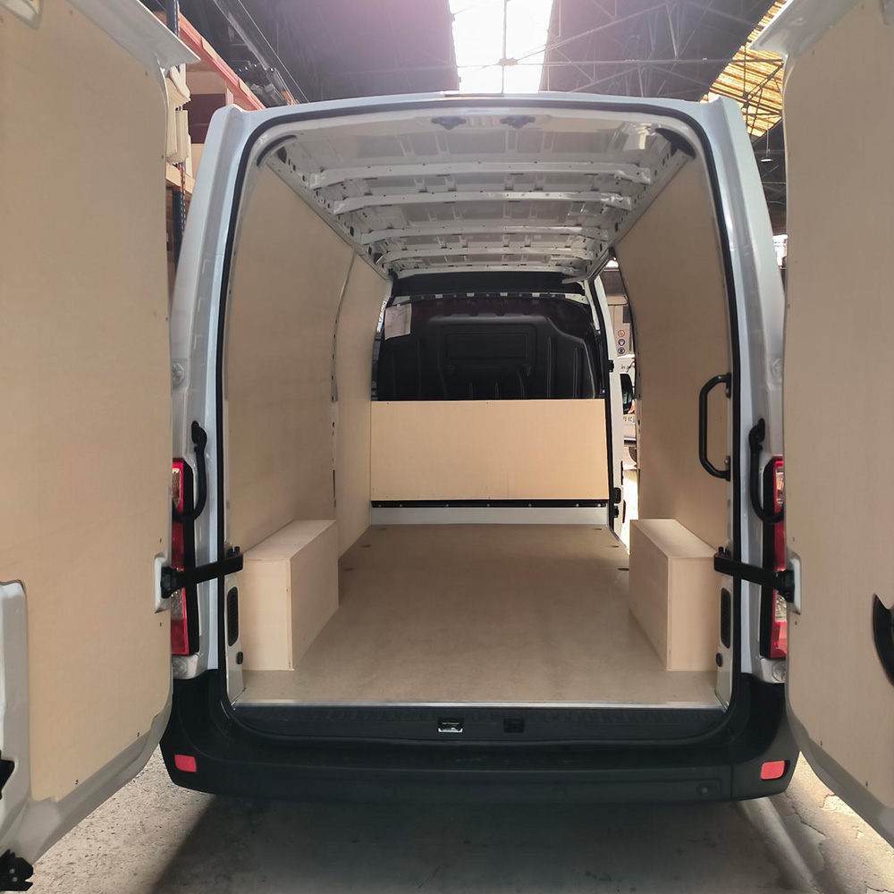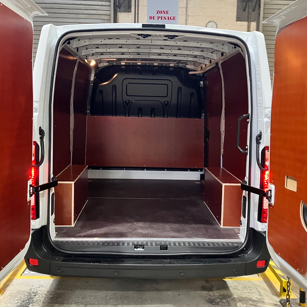 Le Renault Master est une référence pour les professionnels qui ont besoin d’un utilitaire robuste et spacieux. AVD propose des aménagements sur mesure pour exploiter pleinement ses volumes : habillage bois filmé ou polypropylène, plancher antidérapant, modules de rangement, tiroirs renforcés et étagères métier.