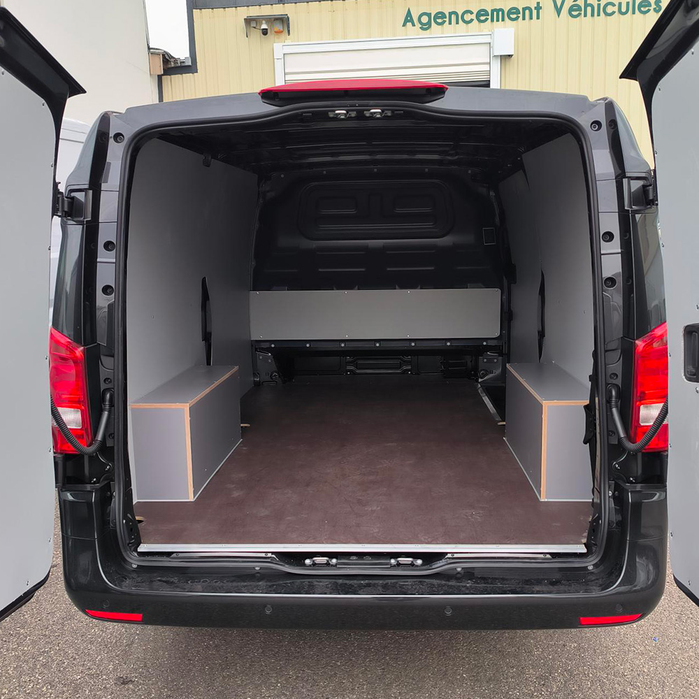 Le Mercedes-Benz Vito est un utilitaire compact qui allie élégance, maniabilité et capacité de chargement, parfaitement adapté aux déplacements urbains. Chez AVD, nous proposons des aménagements intérieurs sur mesure pour optimiser chaque centimètre : habillage en bois filmé ou en polypropylène, plancher antidérapant, modules de rangement, tiroirs fonctionnels et rails d’arrimage.